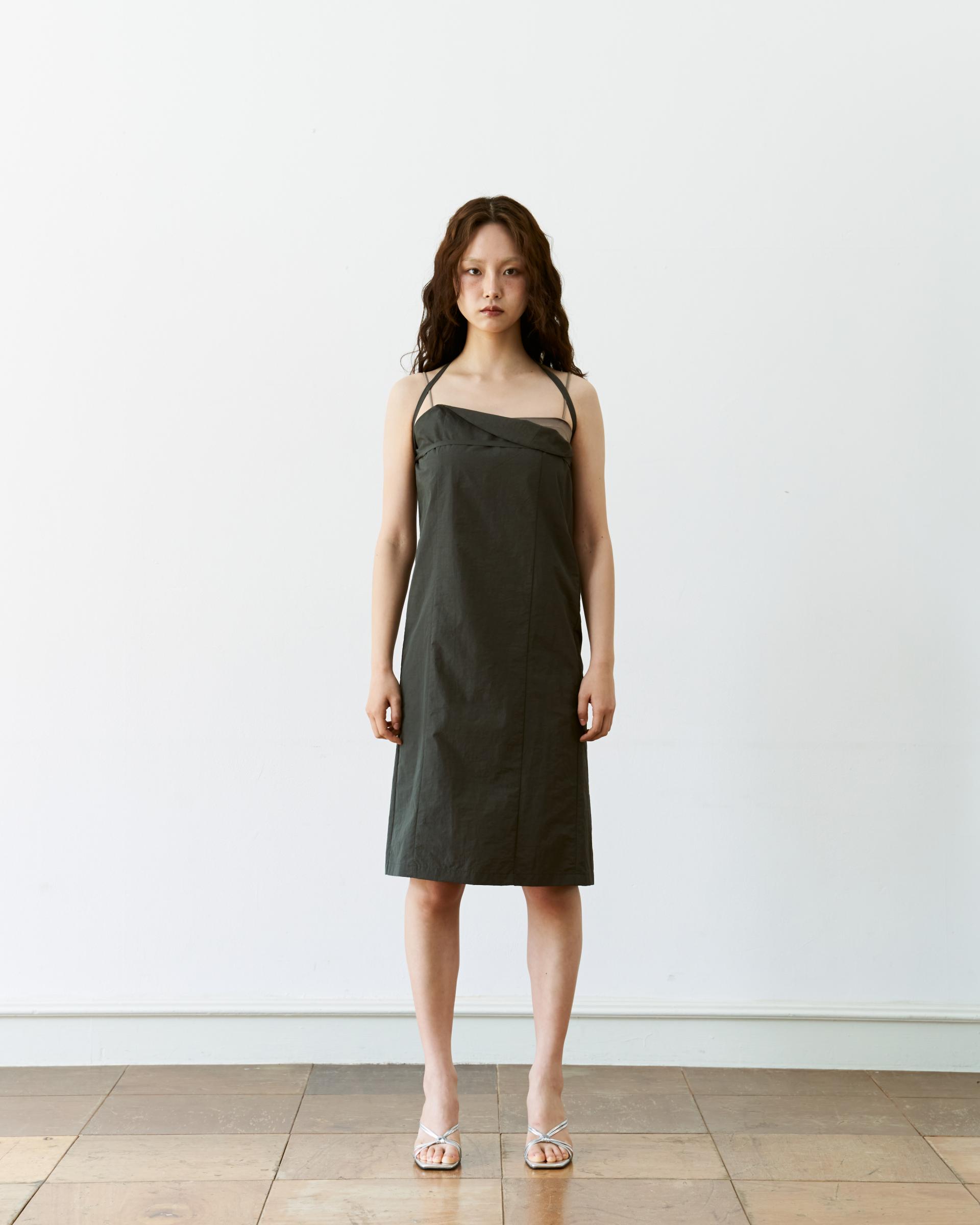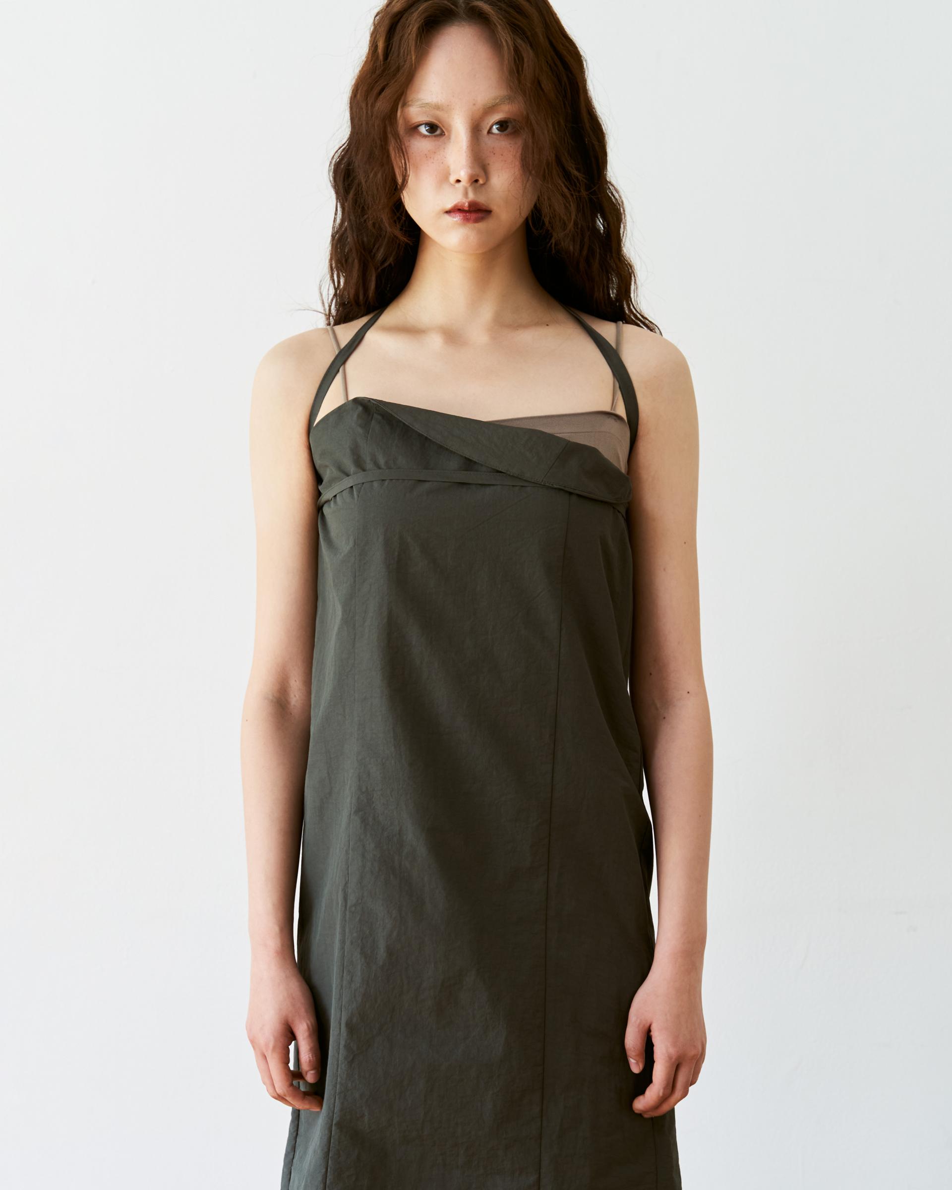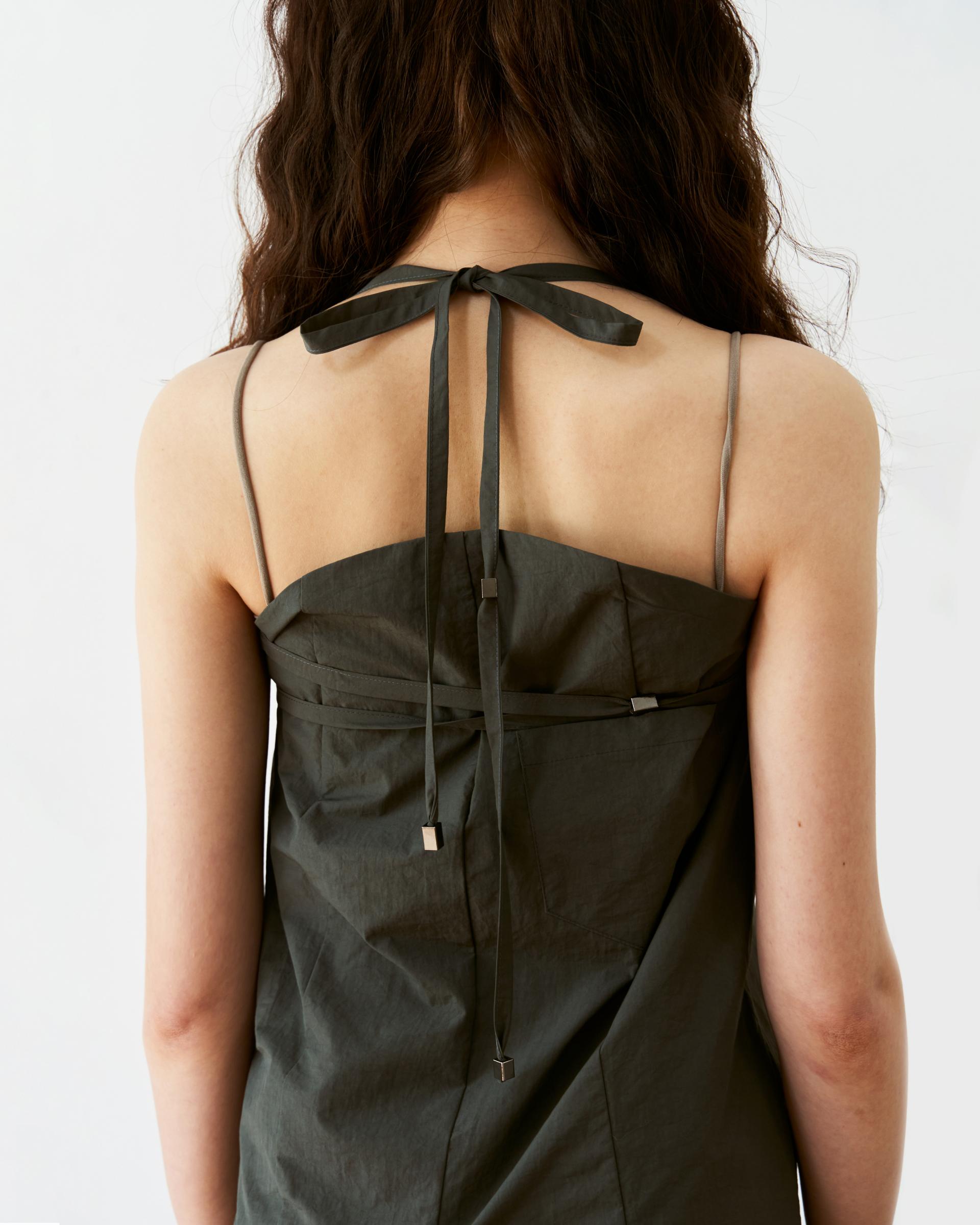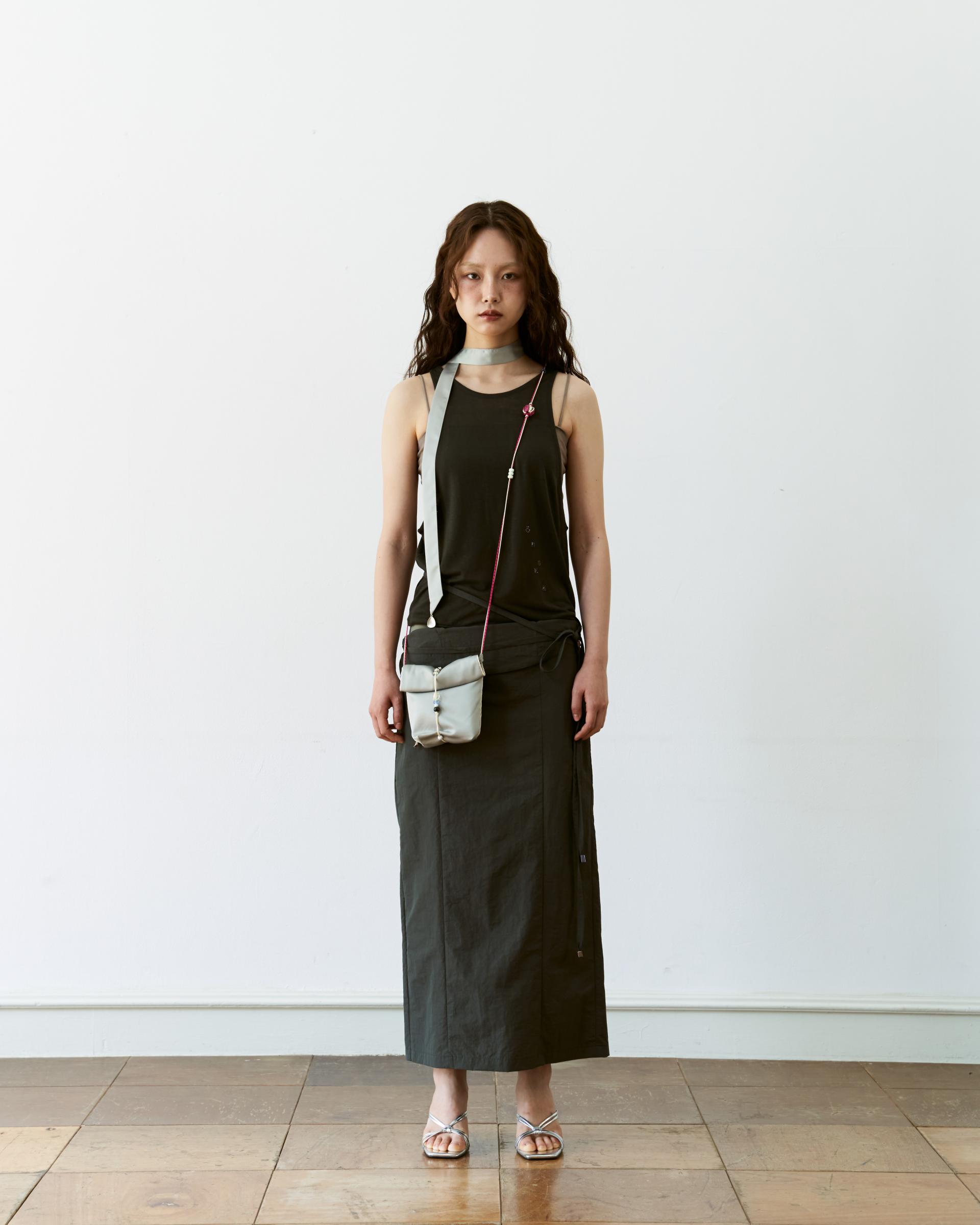 90cm의 롱한 기장의 맥시 스커트 입니다. 몸 전체를 지나는 절개 라인으로 허리와 엉덩이 라인을 잡아주고 발목까지 일자로 떨어지도록 디자인 되었습니다. 힙을 덮는 안단으로 비침을 잡아주며 골반에서 시작되는 로우 웨이스트로 제작되었습니다. 길이가 다른 두 개의 스트링을 활용해 리본을 묶어 롱스커트로 연출 할 수 있으며 목 뒤로 둘러 원피스 형태로 활용할 수 있는 두가지 스타일링이 가능합니다.