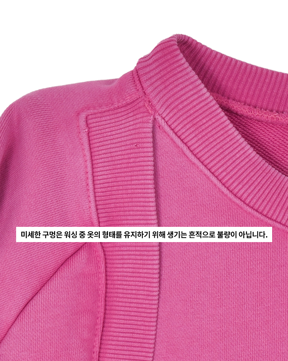 워싱 작업으로 인해 맨투맨의 양쪽 네크라인 주변으로 워싱 흔적이 있을 수 있으며 이는 불량이 아닙니다.