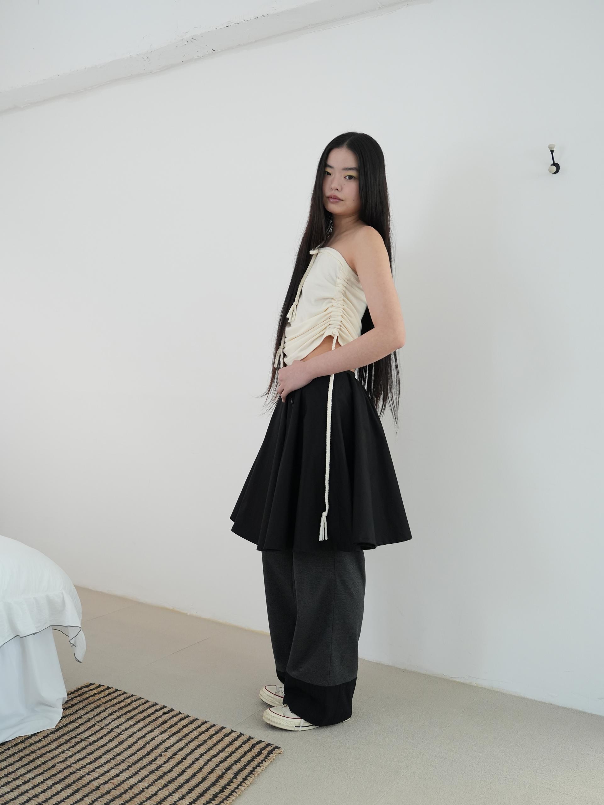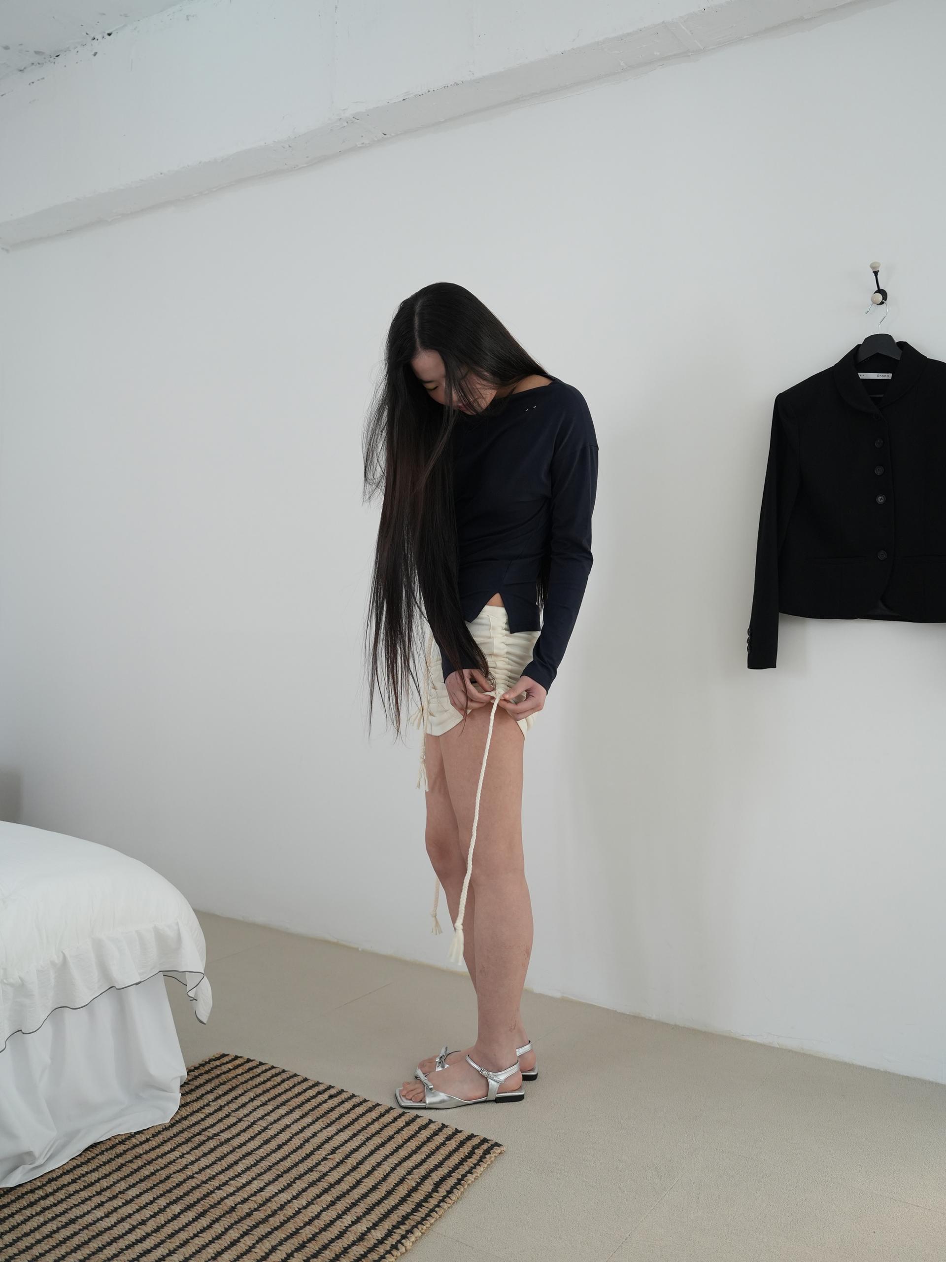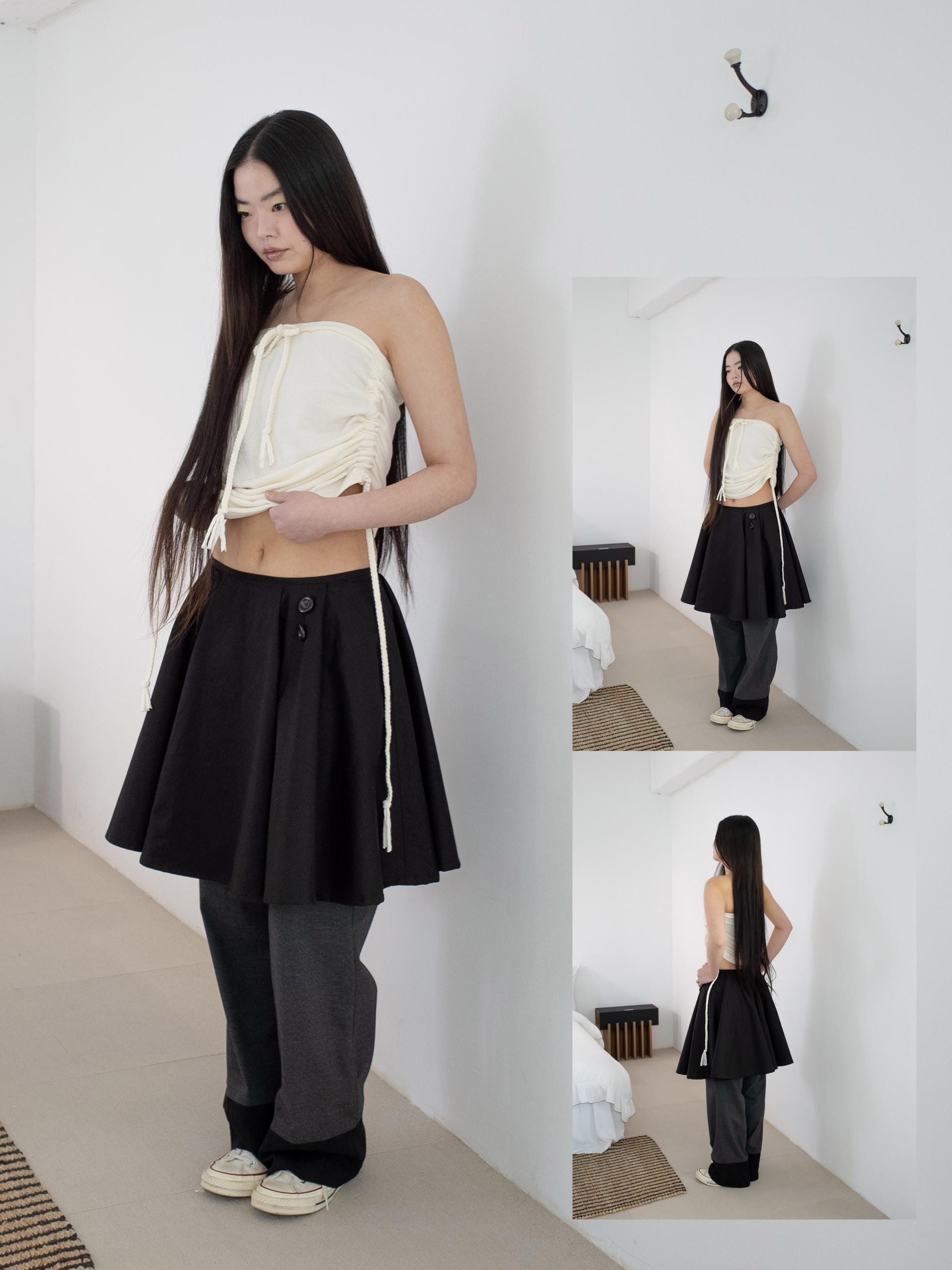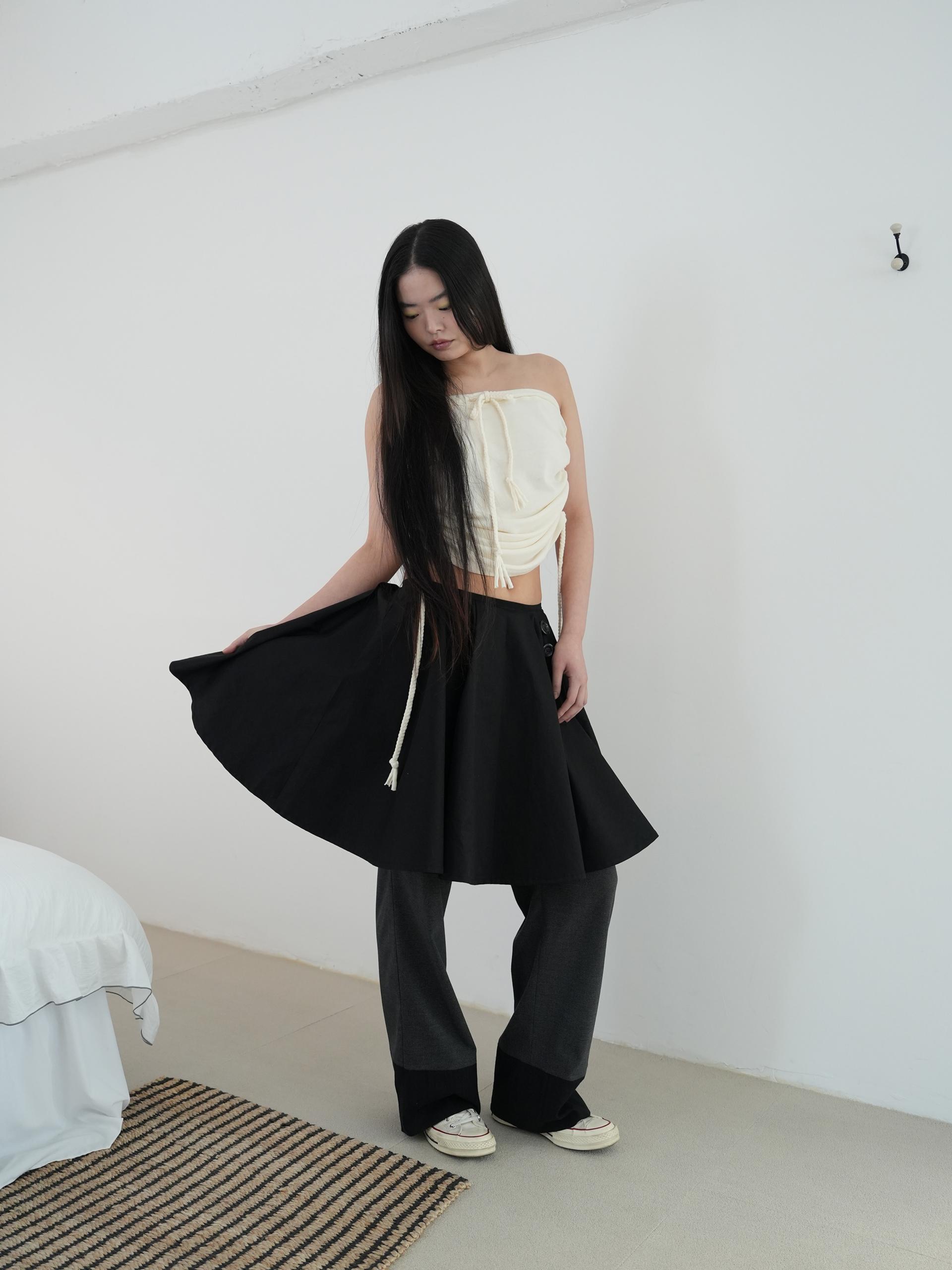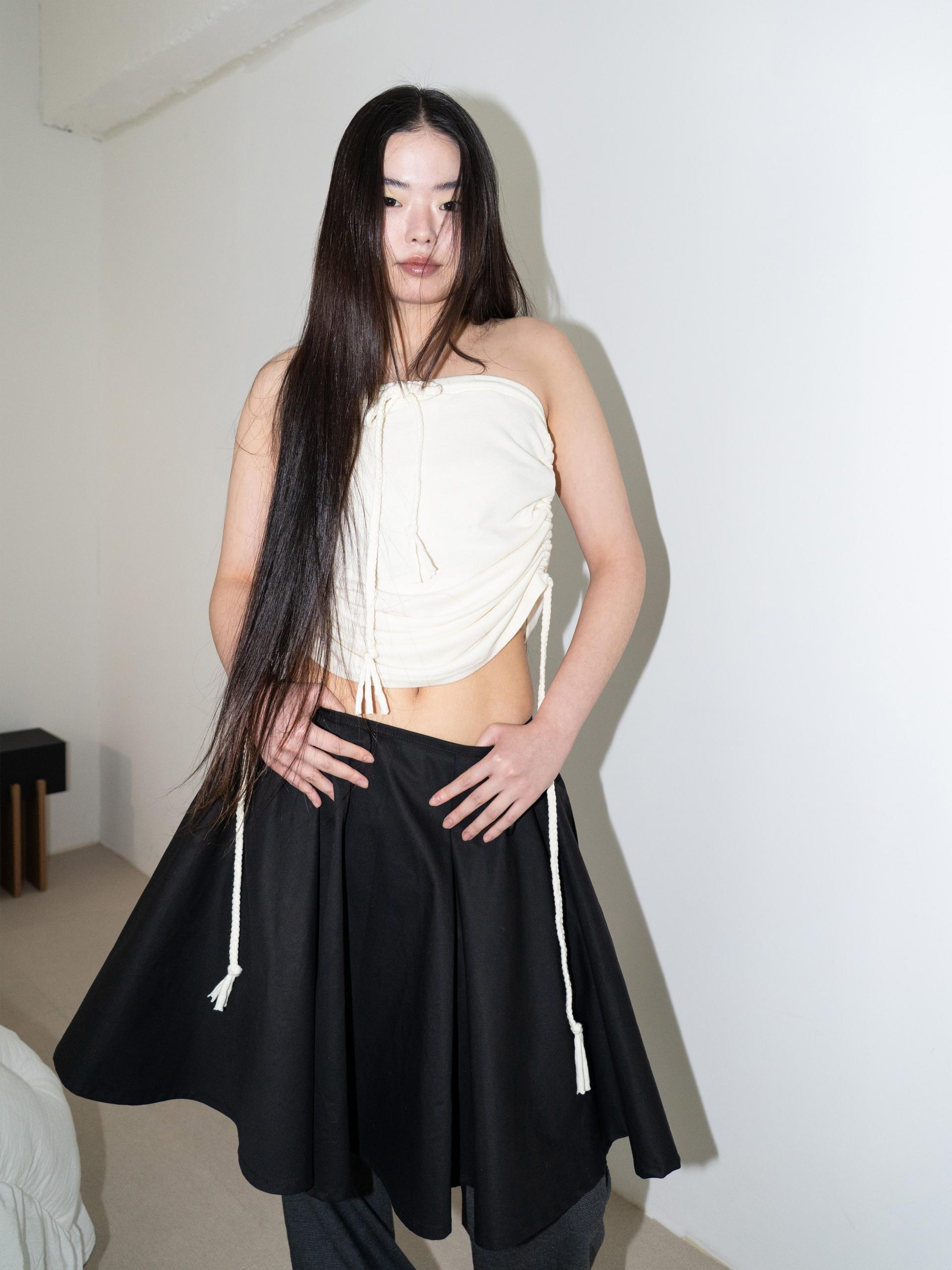 끈을 활용하여 짧은 기장의 셔링 스커트, 길게 내려 팬슬스커트, 혹은 탑으로도 자유롭게 활용할 수 있는 BRAID TIE SKIRT.