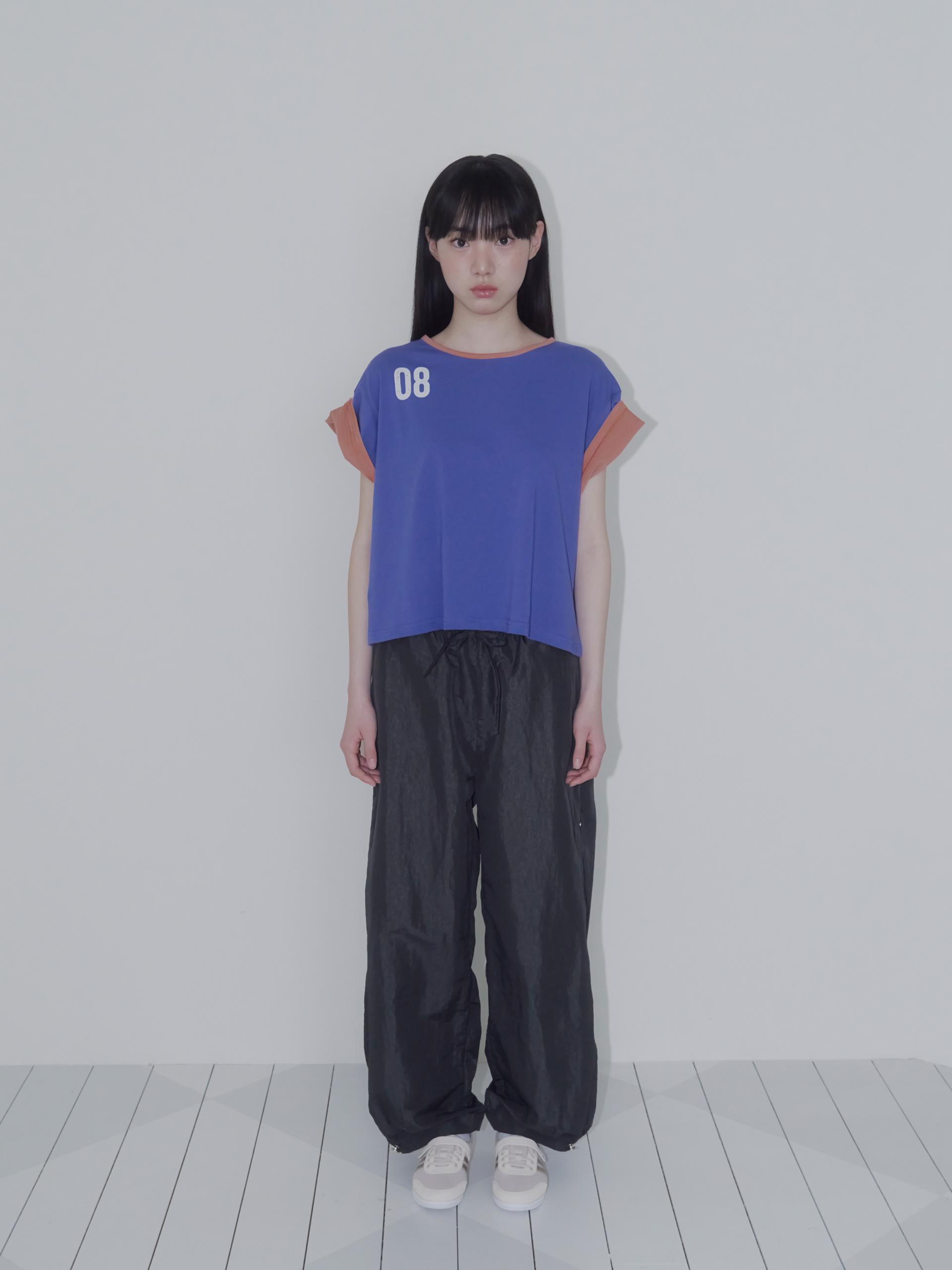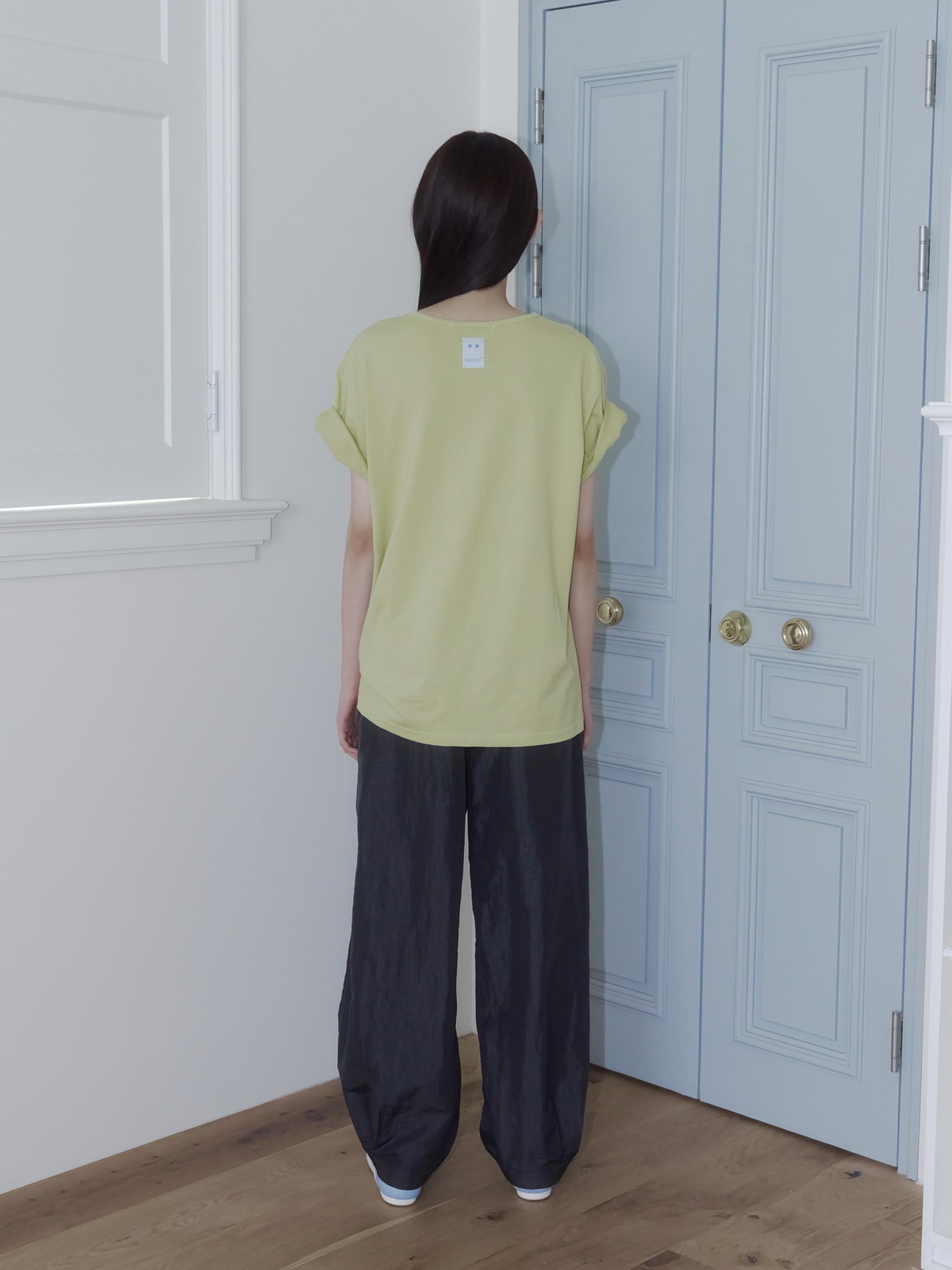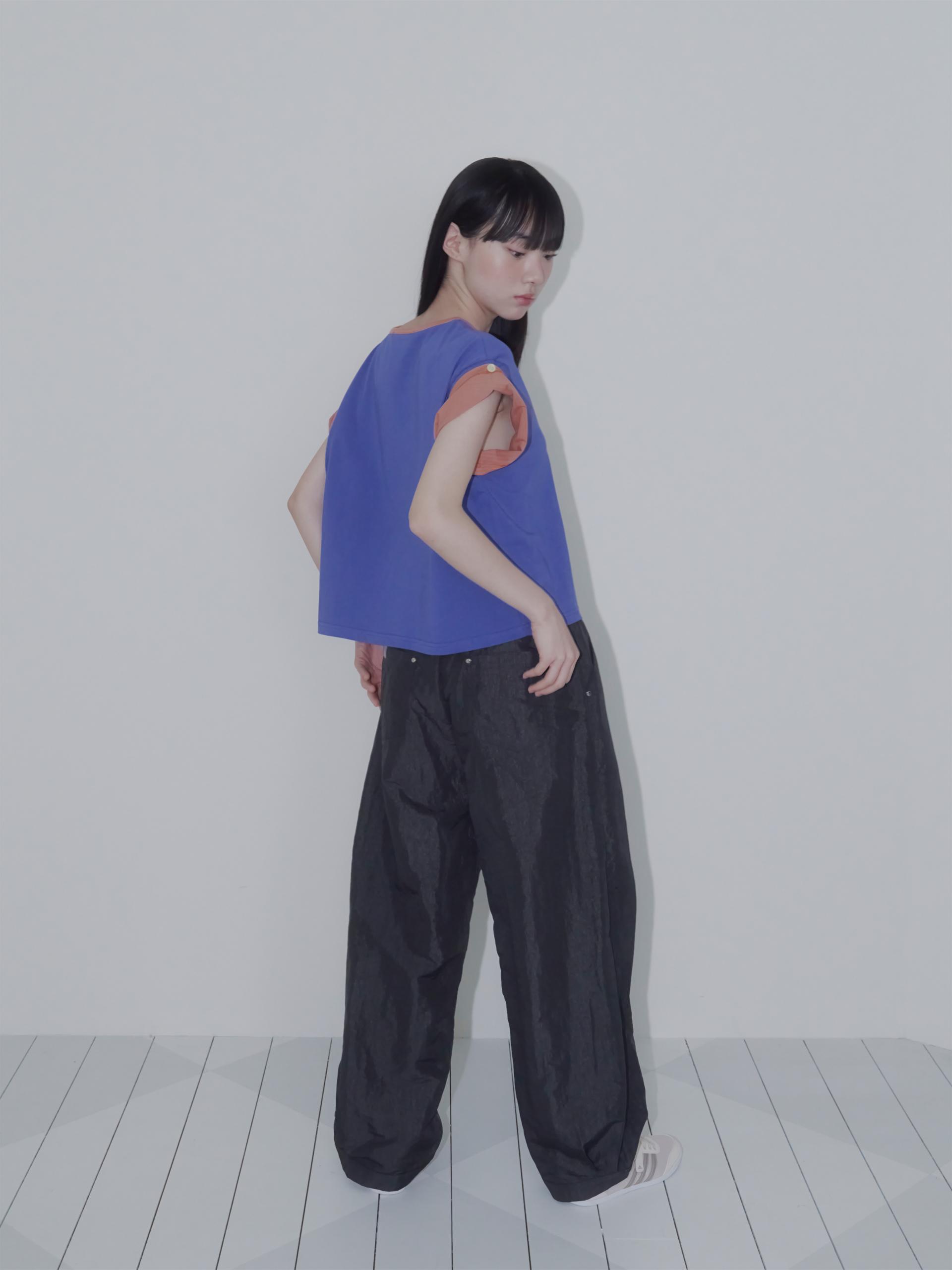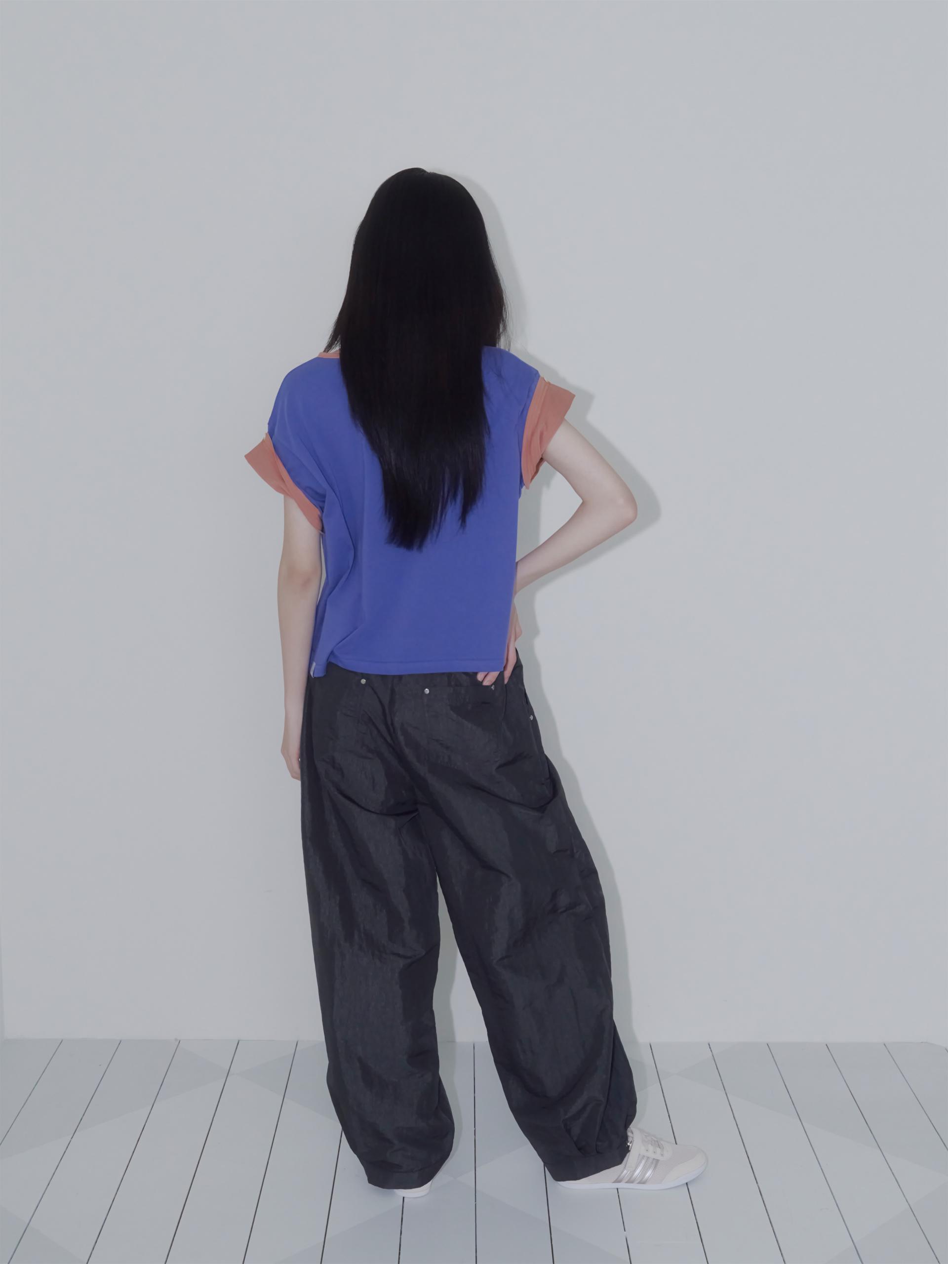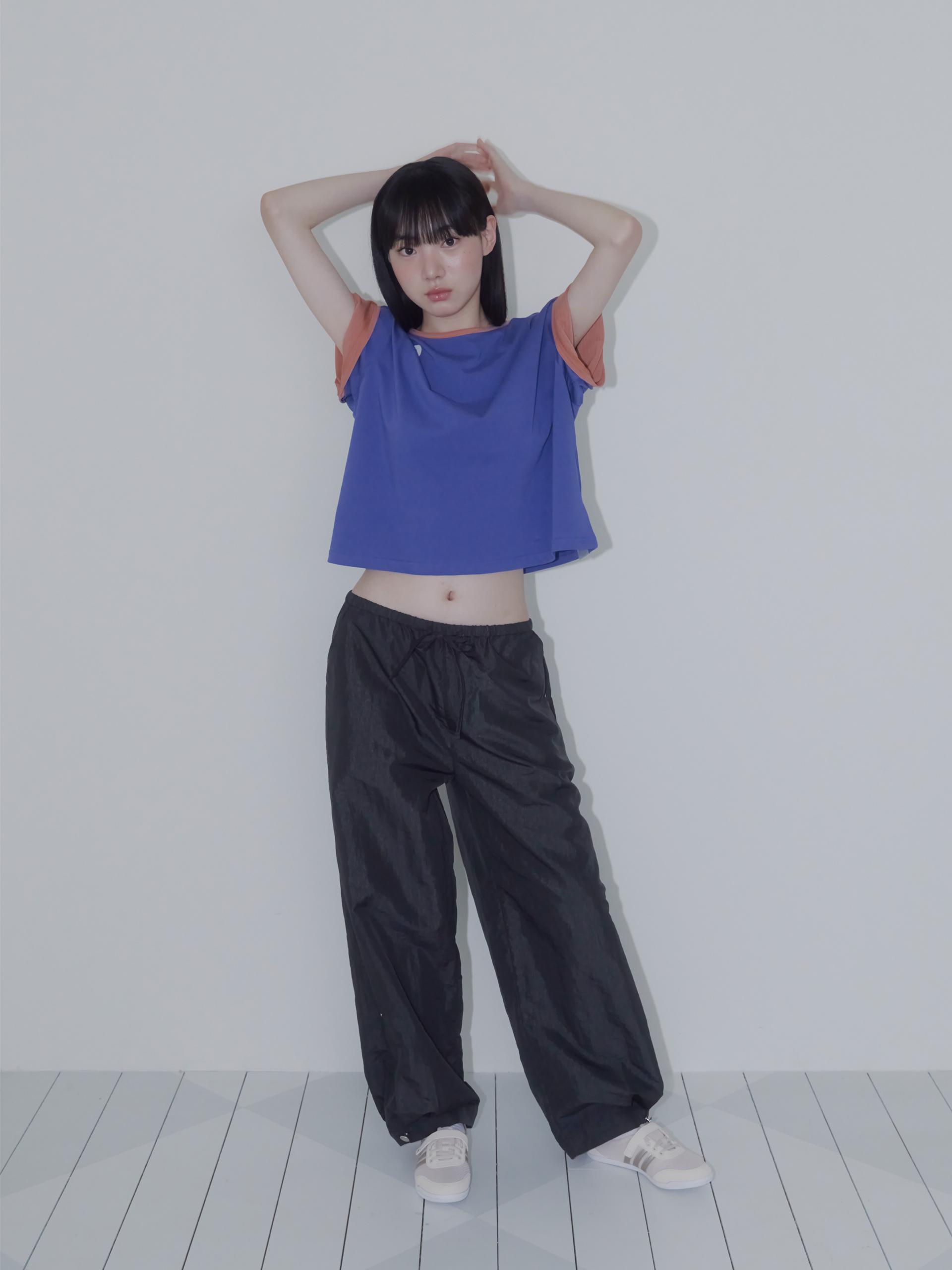 텍스처 표면에 가볍게 반짝이는 질감이 특징이며, 옆선을 따라 좌우 서로 다른 위치에 스터드 장식을 더해 포인트를 주었습니다. 전체적으로 여유 있게 떨어지는 라운드형 루즈 실루엣이며, 밑단에는 턱 디테일을 넣어 구조감을 살렸습니다. 적당한 두께의 나일론 소재로 여름 내내 다양한 스타일링이 가능하며, 허리 밴딩 처리로 편안하게 착용하실 수 있는 팬츠입니다.