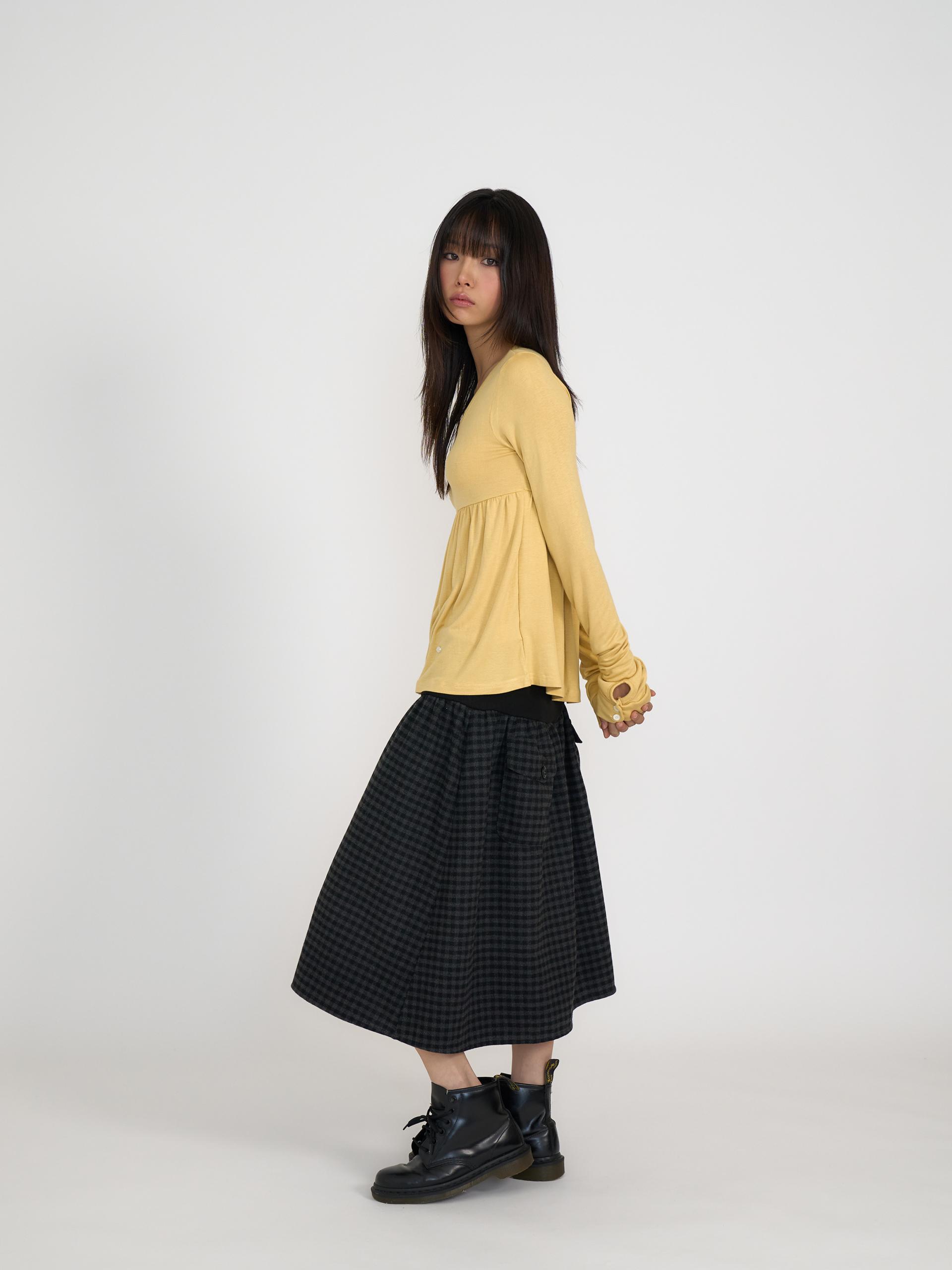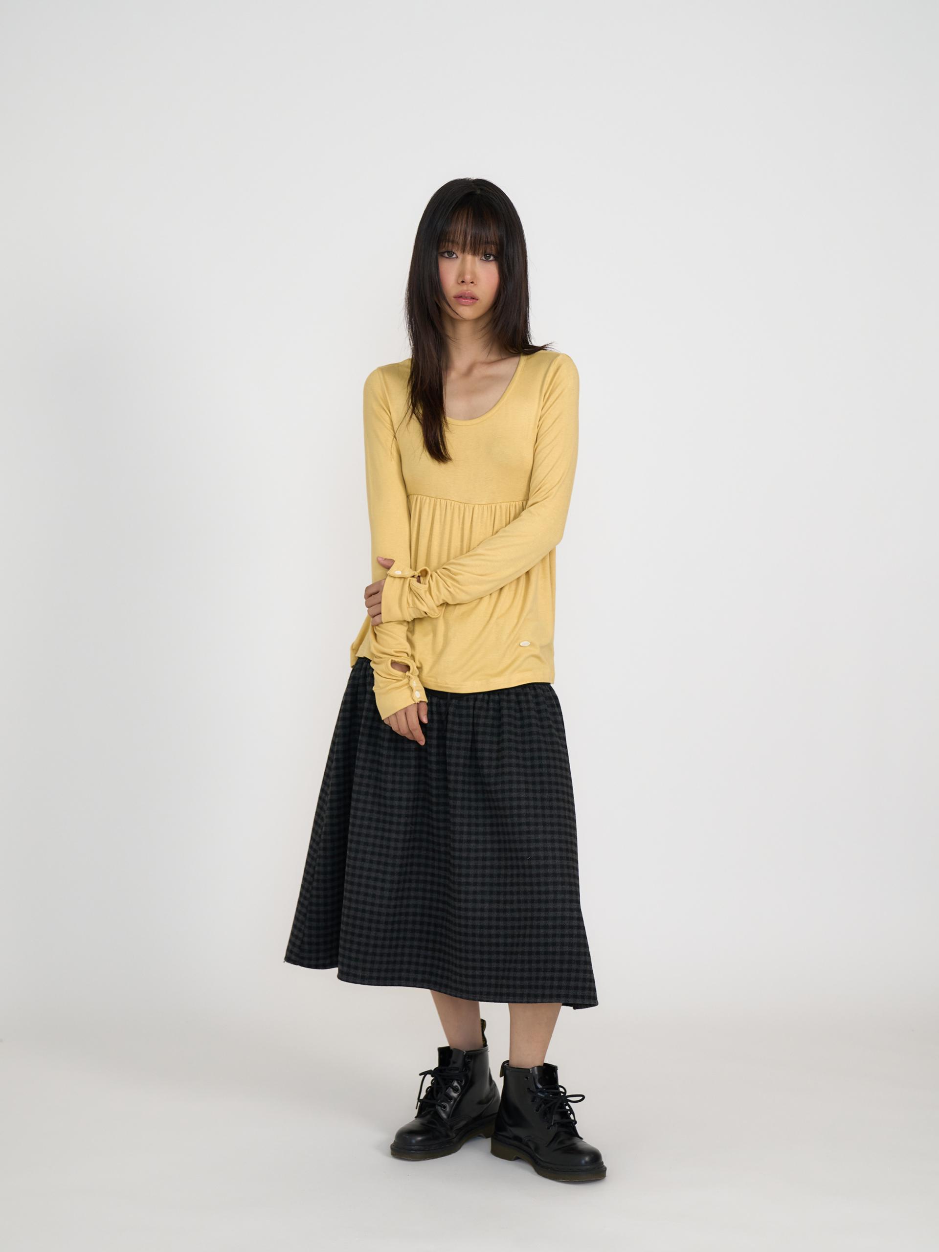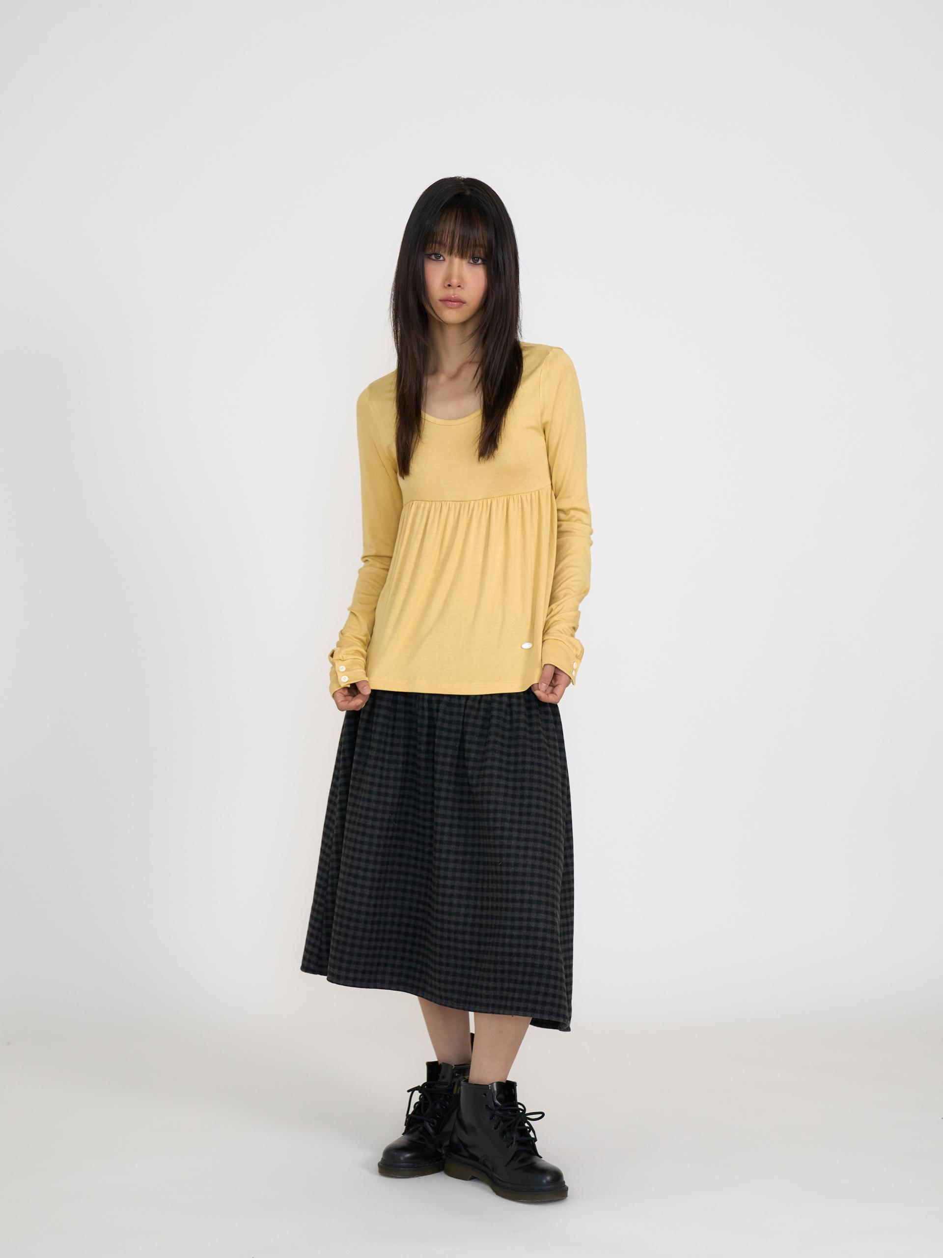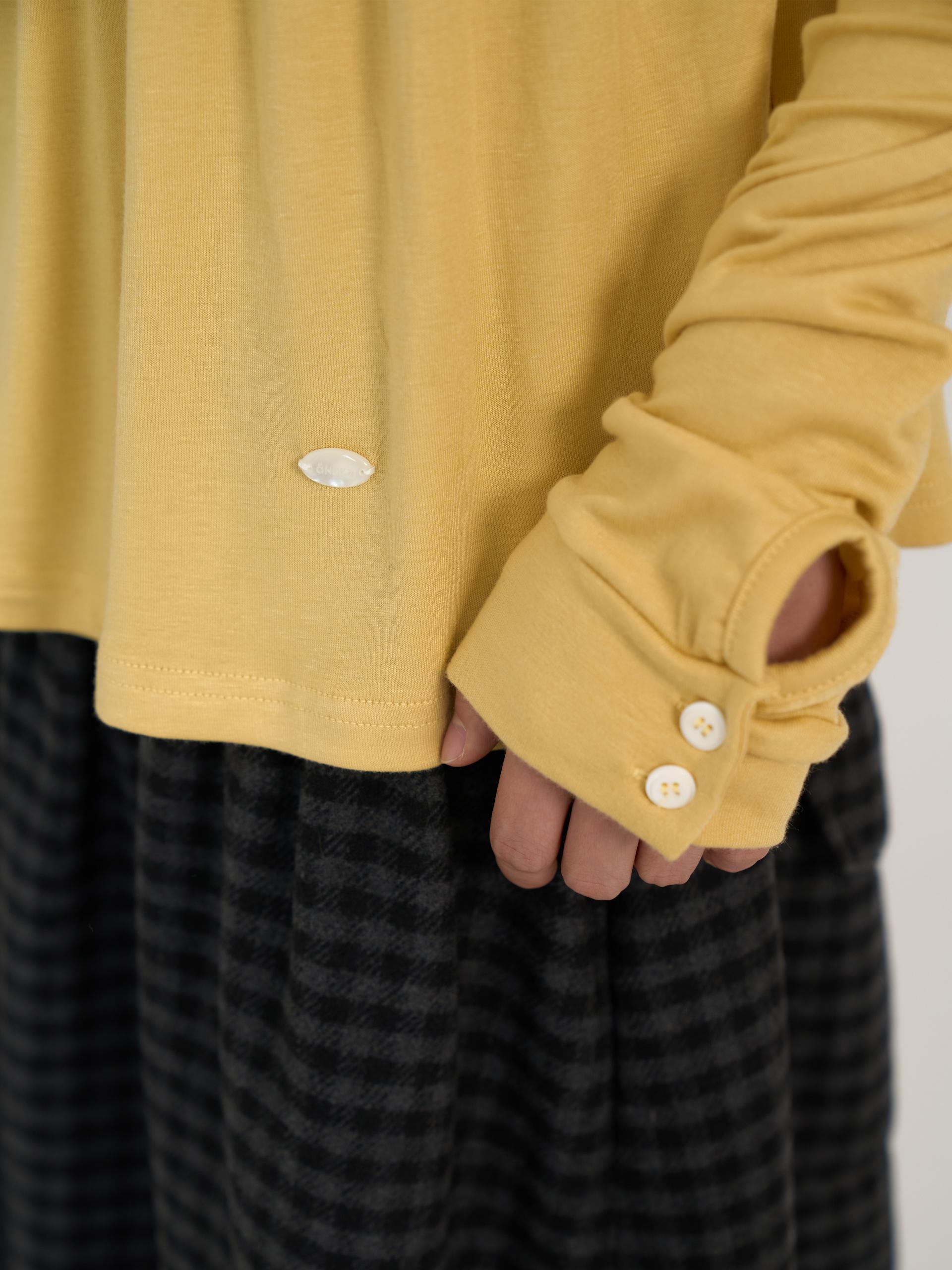 스쿱넥으로 깊게 파인 네크라인과 절개 아래로 퍼지는 플레어 라인이 사랑스러운 무드를 연출합니다. 루즈한 소매 끝에 단추 포인트를 더해 여리한 분위기를 살렸으며, 흐르는 듯한 부드러운 원단이 바디라인을 자연스럽게 감싸줍니다. 온스카의 로고가 각인된 버튼 포인트를 더했습니다. 옐로우·블랙·스트라이프 그레이 세 가지 컬러로 출시되었습니다.