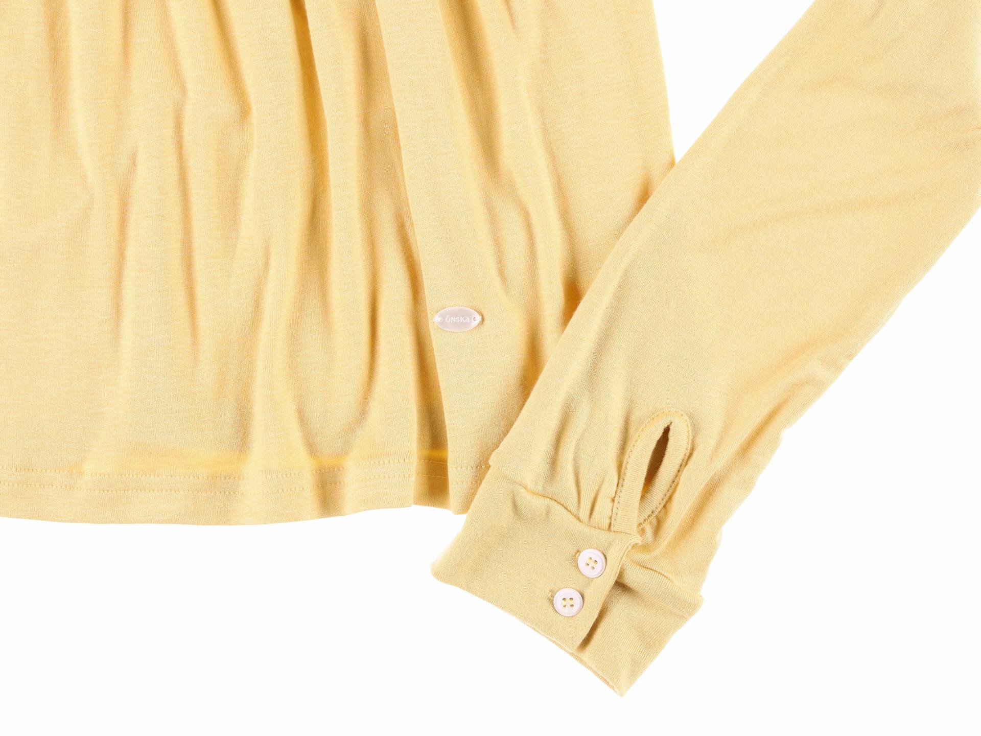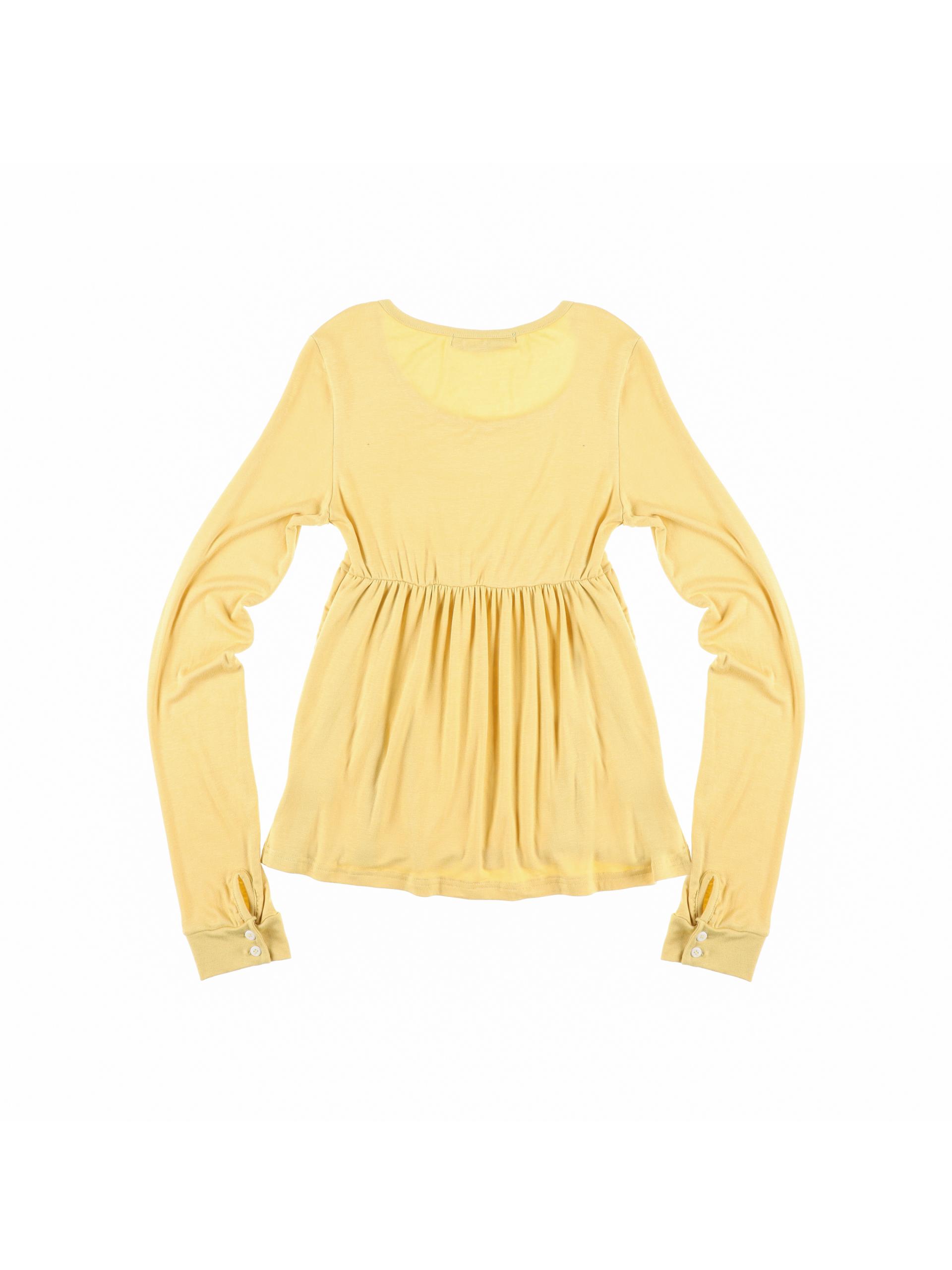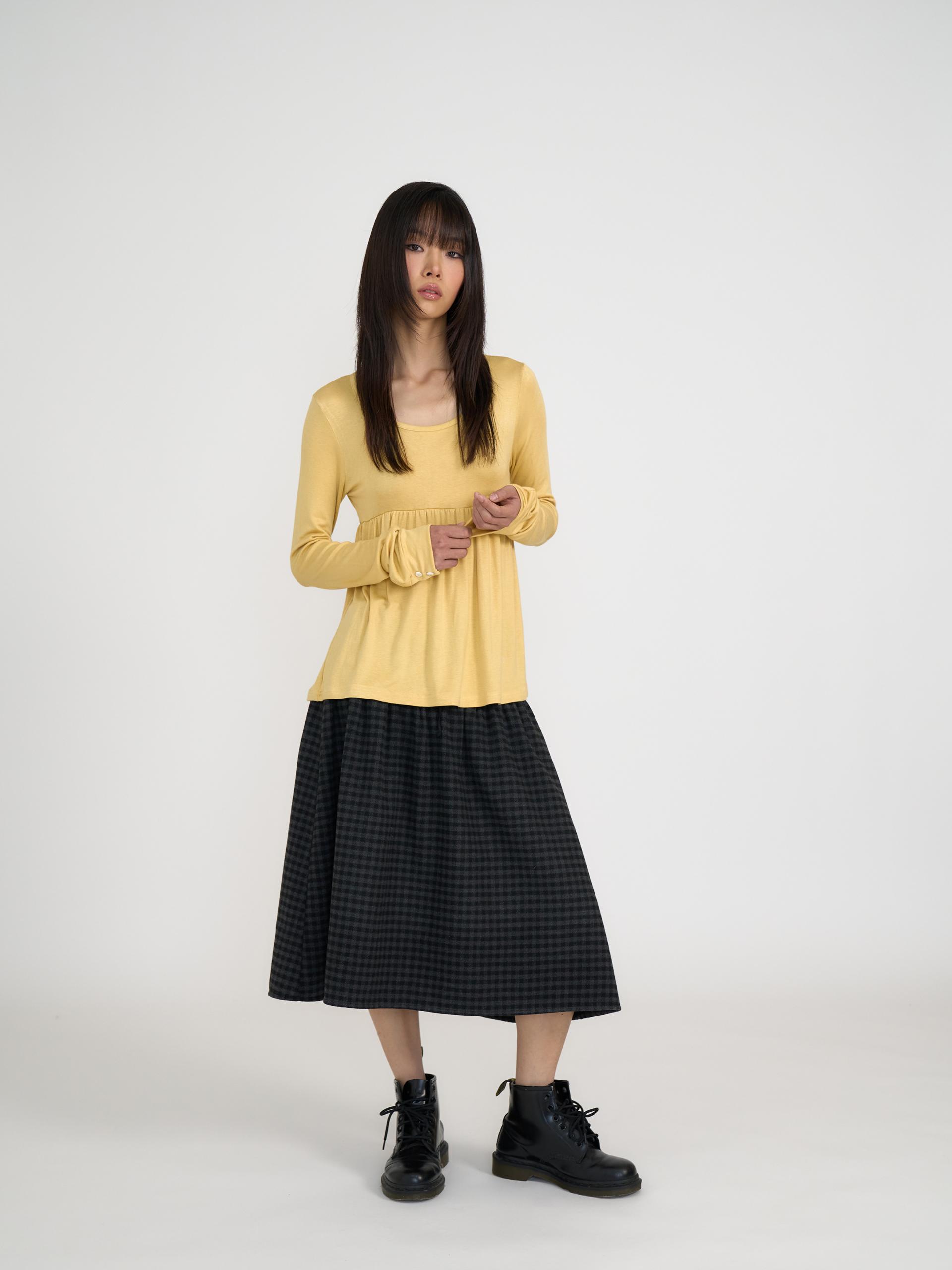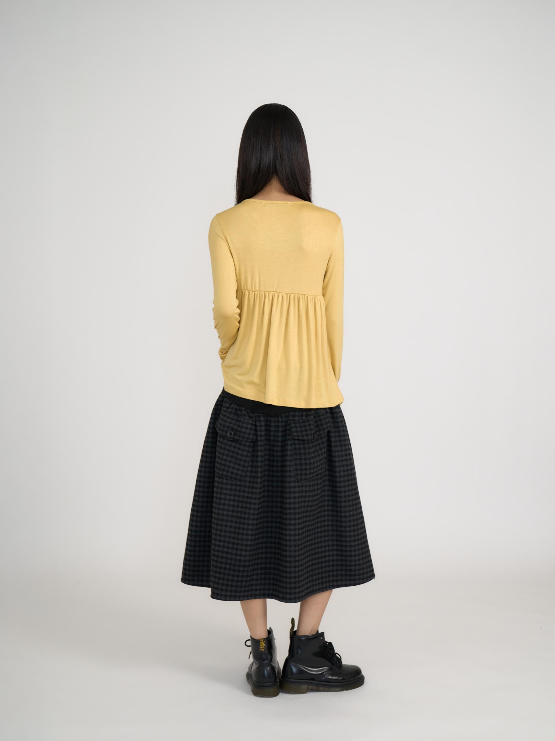 스쿱넥으로 깊게 파인 네크라인과 절개 아래로 퍼지는 플레어 라인이 사랑스러운 무드를 연출합니다. 루즈한 소매 끝에 단추 포인트를 더해 여리한 분위기를 살렸으며, 흐르는 듯한 부드러운 원단이 바디라인을 자연스럽게 감싸줍니다. 온스카의 로고가 각인된 버튼 포인트를 더했습니다. 옐로우·블랙·스트라이프 그레이 세 가지 컬러로 출시되었습니다.